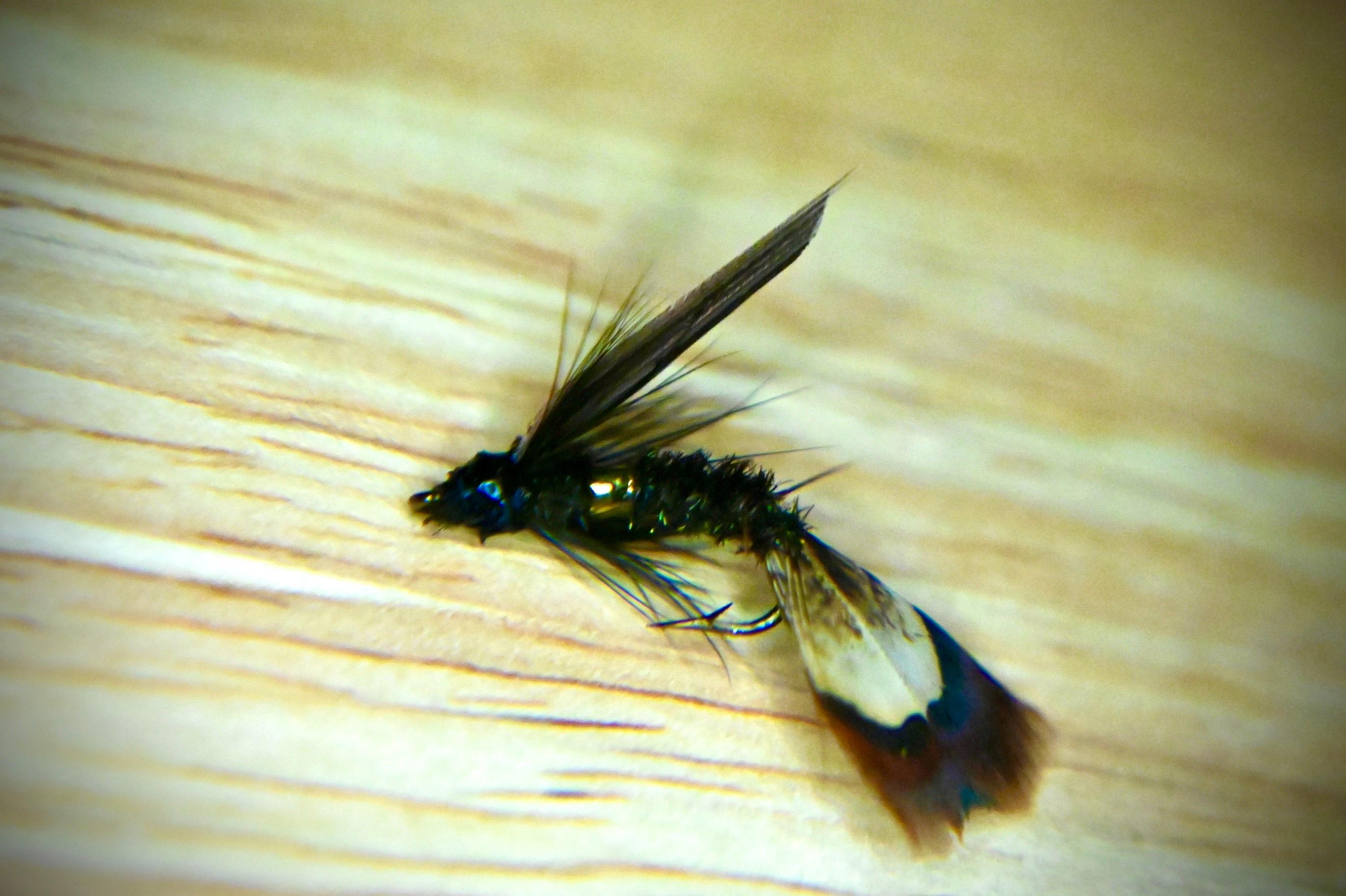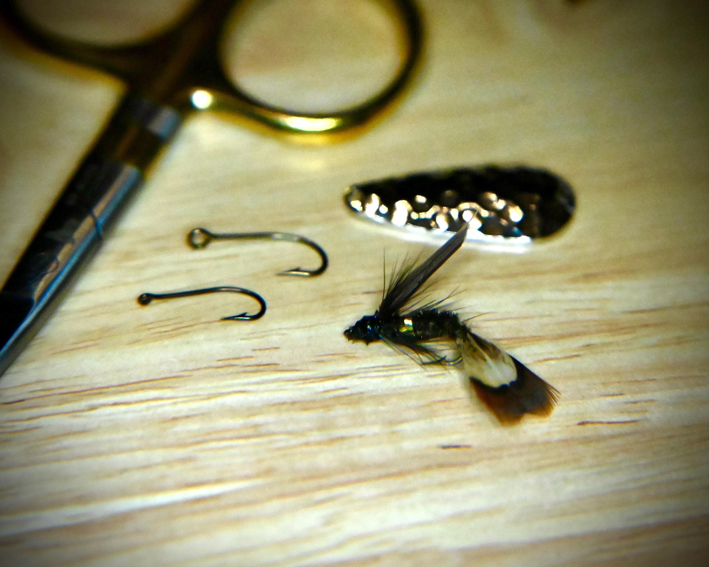 The hammered spoon throws off irregular flashes, mimicking fleeing baitfish and aquatic insects, the soft feathered tail breathes and pulses in the water, triggering instinct strikes. Pheasant and gold wrapped body of the fly glistens again, pulling fish back if a miss occurred. With iridescent green pheasant wrap, white brown quail tail and hackle and gold flat wrap, finished with a hammered spoon is just as pretty as it is effective.