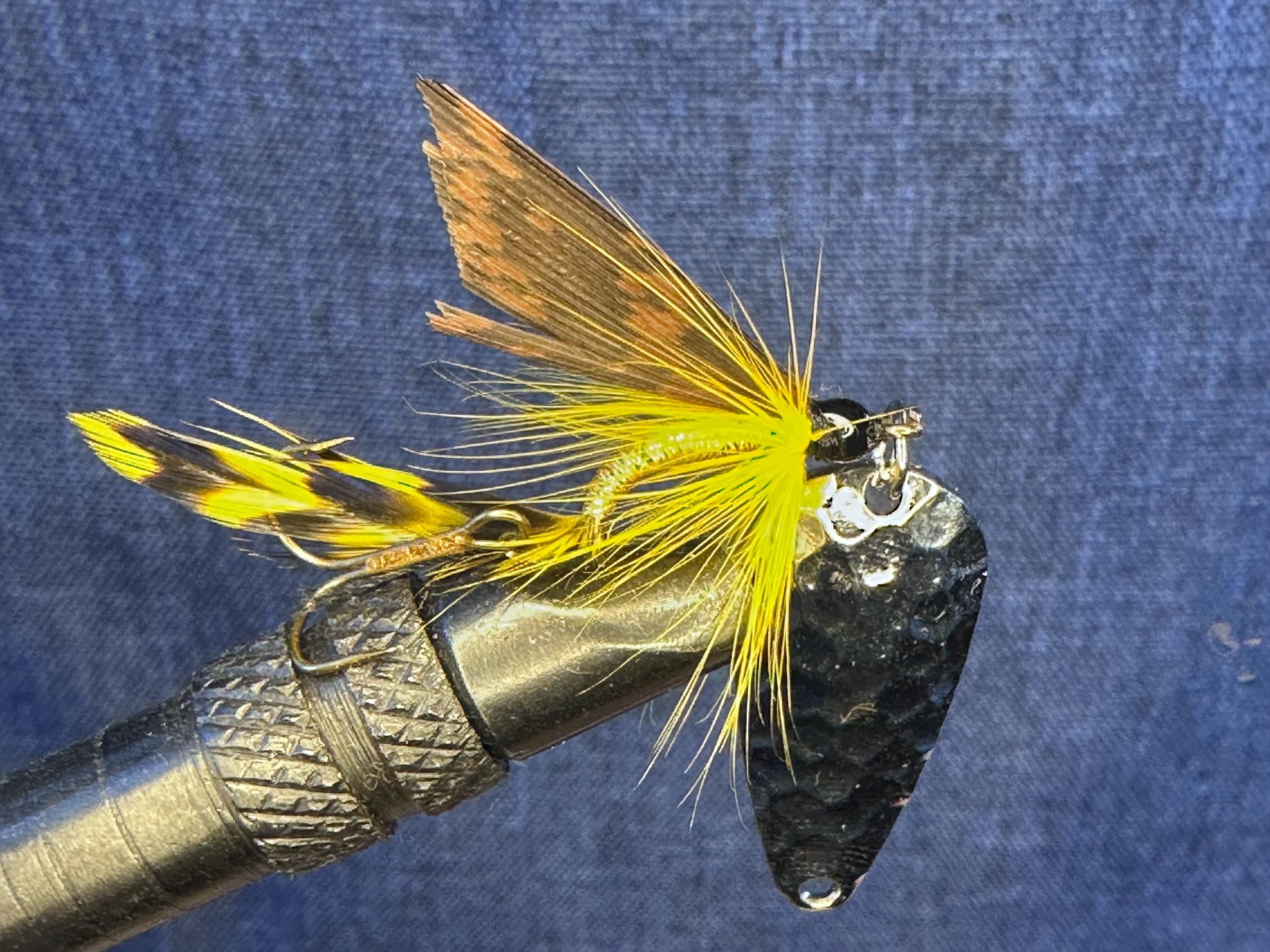 Bright yellow hackle flares and breathes in the water, while the gold-wrapped body adds a subtle natural glow. The dark hammered blade creates vibration and intermittent flash, mimicking an injured insect or small baitfish—especially effective when fish are feeding but not fully committing.